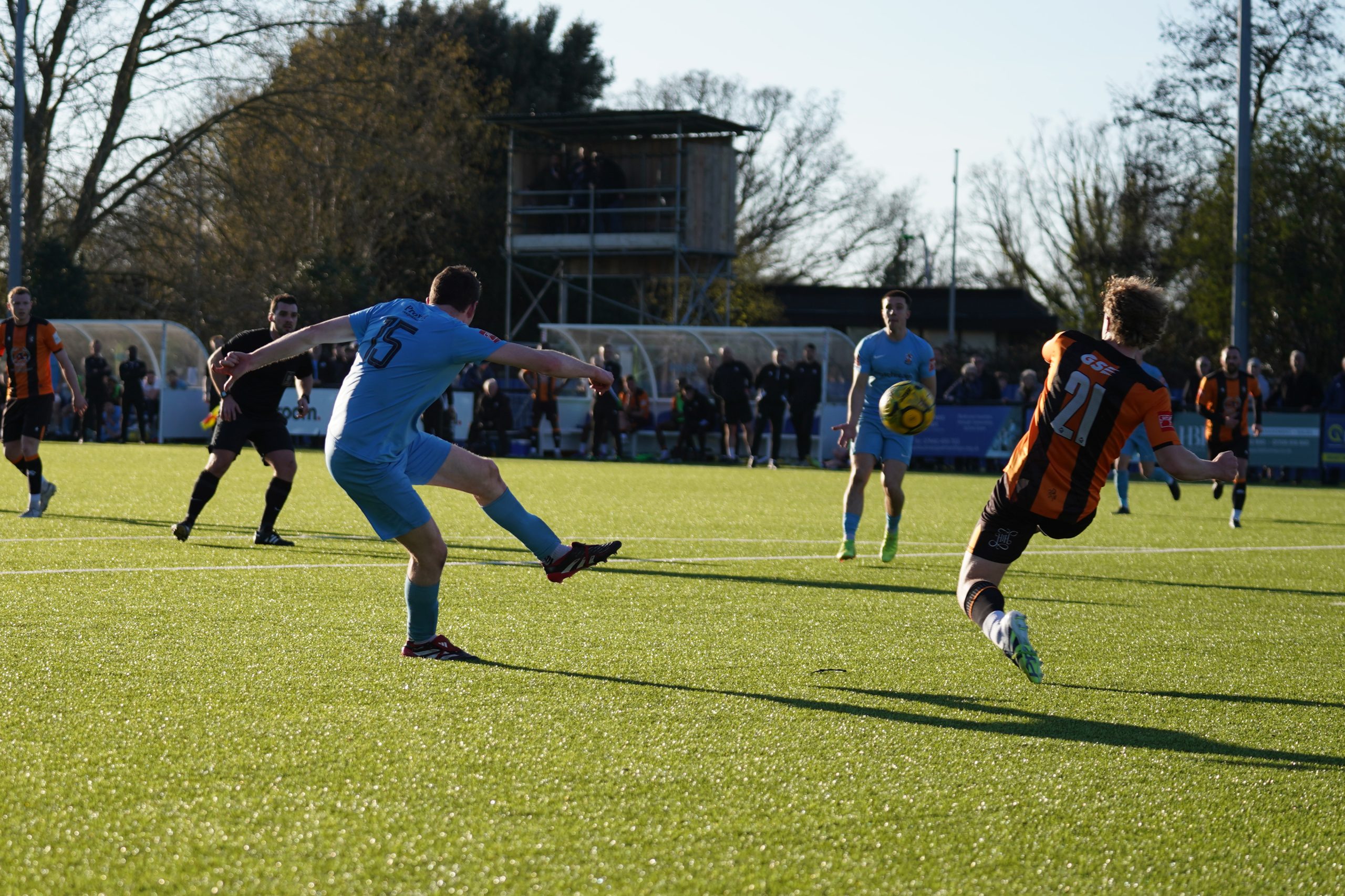 It was a relatively even first half with both sides having their fair share of the ball and opportunities at goal. Brentwood were the first to test the keeper on the 13-minute mark after Freddie Gard had an effort from outside of the box, but Matthew Cafer was able to save easily.