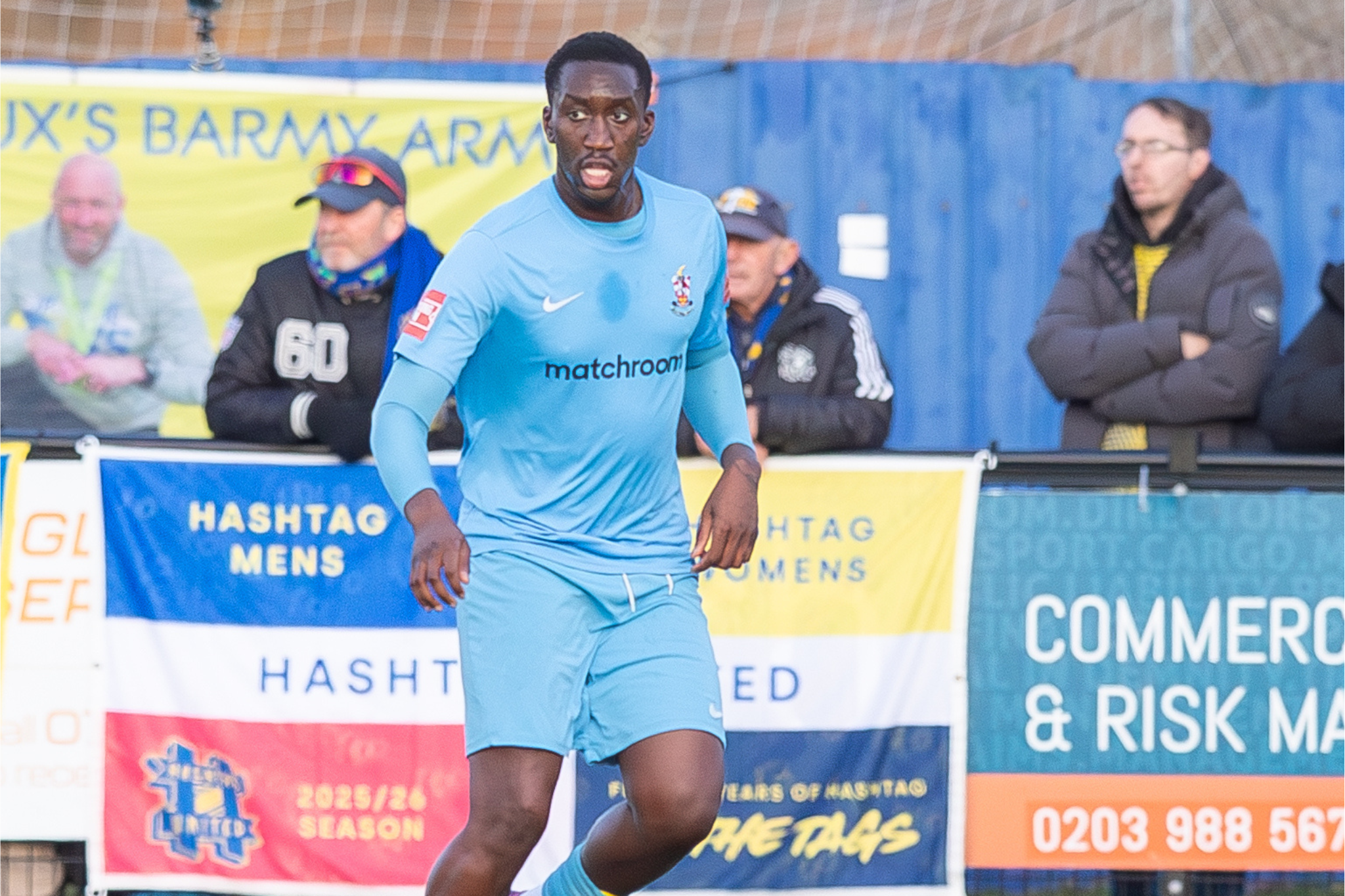 10 minutes later and it was the visitors turn to attack with Callum Harrison picking the ball up near the halfway line. He surged towards goal after space in front of him opened up and unleashed a great effort on target which was worthy of a goal. Brentwood debutant Manny Idem was there to deny him as he dived down low to the left of his goal, making an instant impression with the Blues fans.